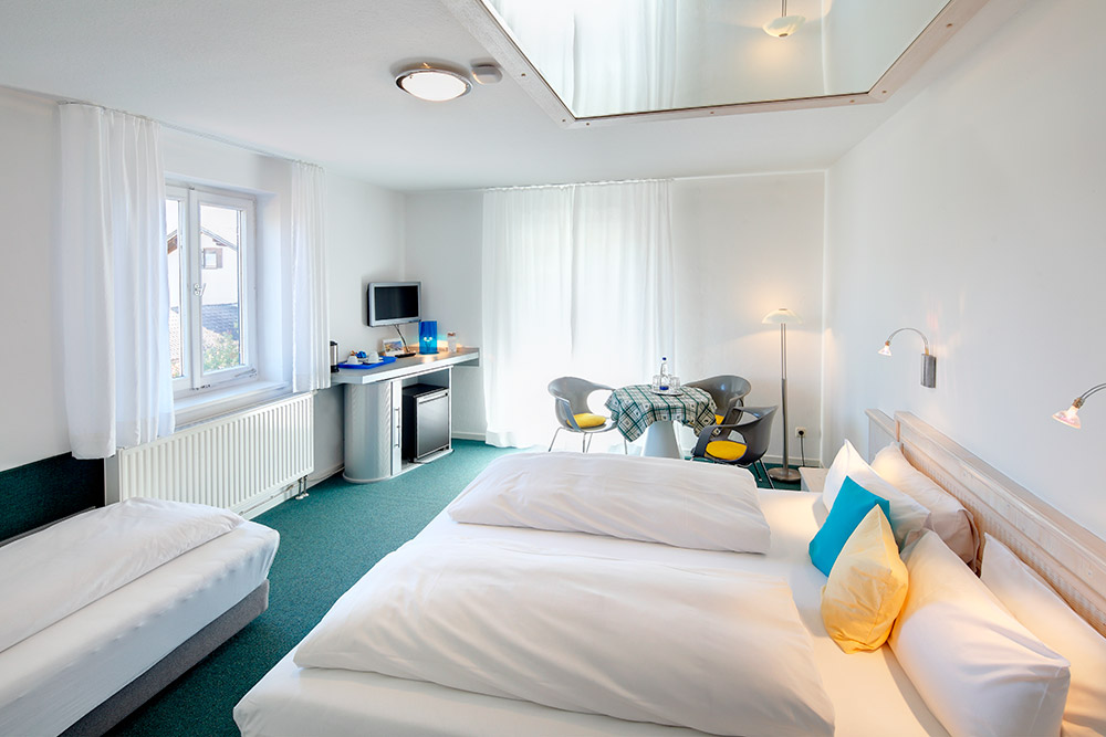 Das Zimmer ist frisch renoviert, modernst und dennoch behaglich eingerichtet. Sie verfügen alle über Fernseher, Safe, Kühlschrank, Kaffeebar und ein Bad mit Dusche, WC und Fön. Das Zimmern hat einen Balkon.